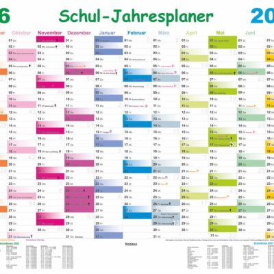 Wochenenden und gesetzliche Feiertage sind mit schönen, kräftigen Farben gekennzeichnet. Die Monate sind in den gleichen Farben hinterlegt, wie die zugehörigen Feiertage und Wochenenden.