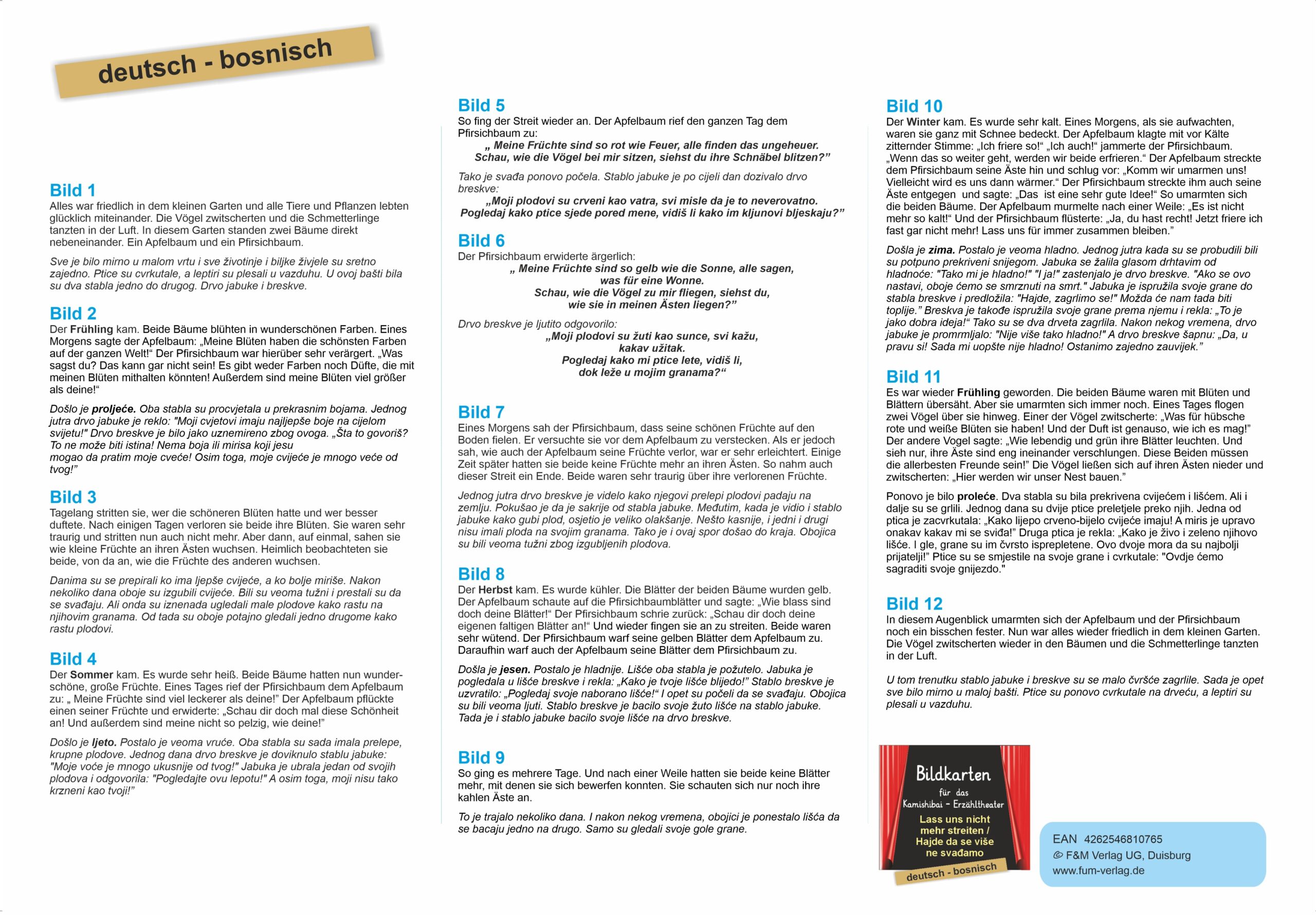 Alle Kamishibais und Kniebücher sind in 27 verschiedenen Sprachen erhältlich: Alles war friedlich in dem kleinen Garten. Und alle Tiere und Pflanzen lebten glücklich miteinander. In diesem Garten standen zwei Bäume. Ein Apfelbaum und ein Pfirsichbaum. Tagelang stritten sie, wer die schöneren Blüten hatte und wer besser duftete…