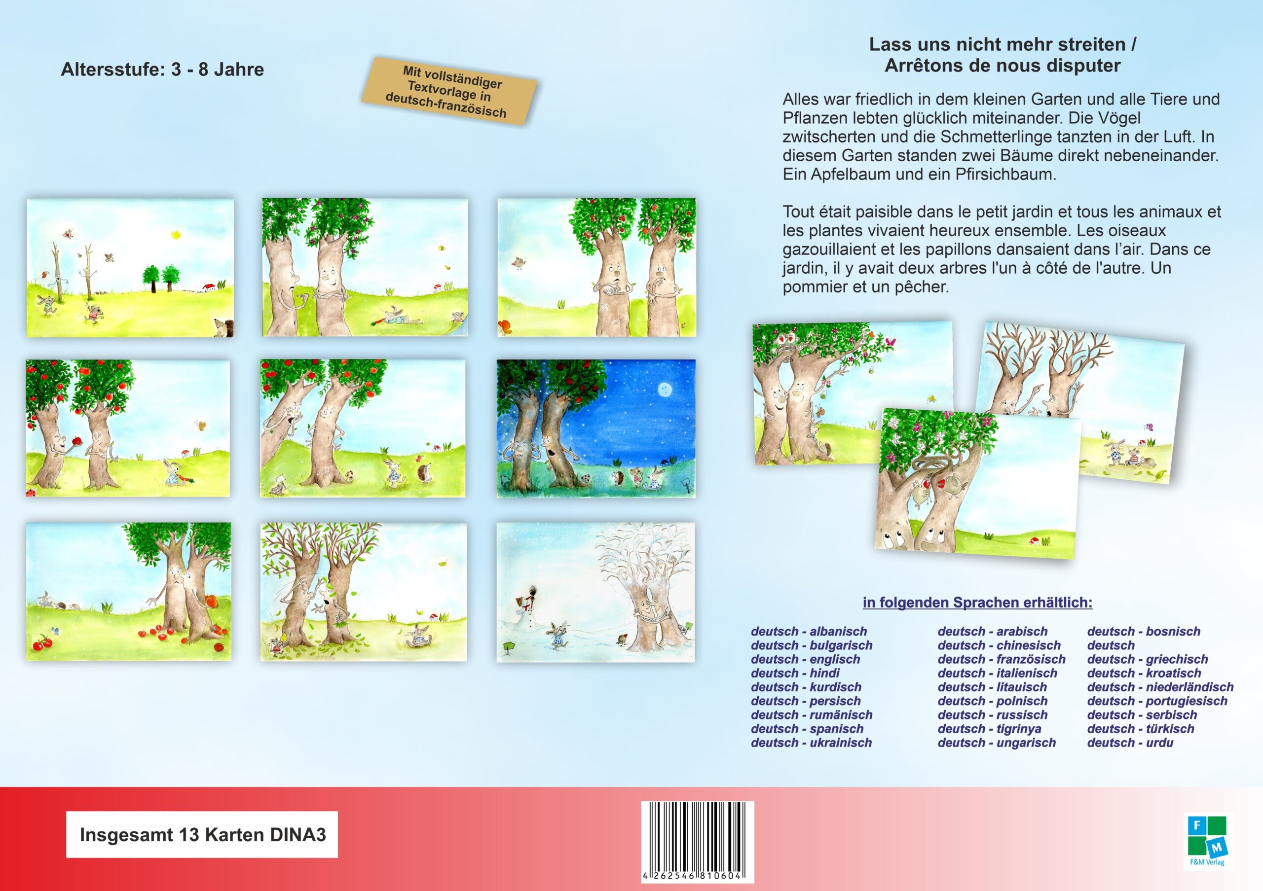 Alle Kamishibais und Kniebücher sind in 27 verschiedenen Sprachen erhältlich: Alles war friedlich in dem kleinen Garten. Und alle Tiere und Pflanzen lebten glücklich miteinander. In diesem Garten standen zwei Bäume. Ein Apfelbaum und ein Pfirsichbaum. Tagelang stritten sie, wer die schöneren Blüten hatte und wer besser duftete…