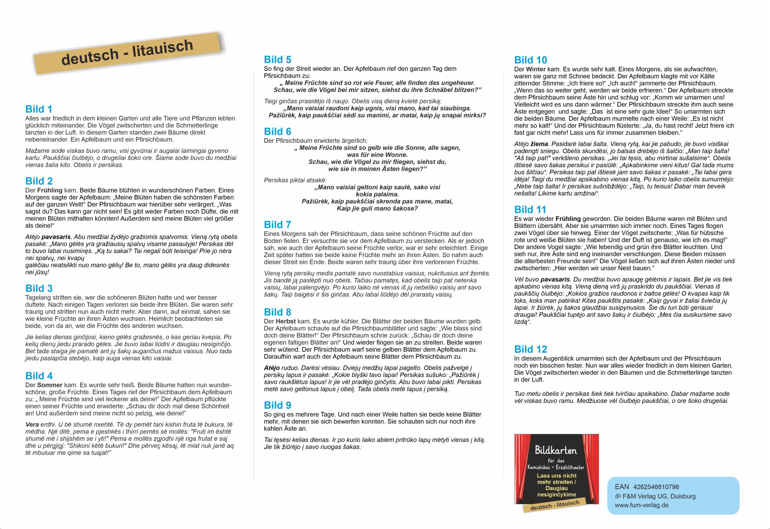 Alle Kamishibais und Kniebücher sind in 27 verschiedenen Sprachen erhältlich: Alles war friedlich in dem kleinen Garten. Und alle Tiere und Pflanzen lebten glücklich miteinander. In diesem Garten standen zwei Bäume. Ein Apfelbaum und ein Pfirsichbaum. Tagelang stritten sie, wer die schöneren Blüten hatte und wer besser duftete…