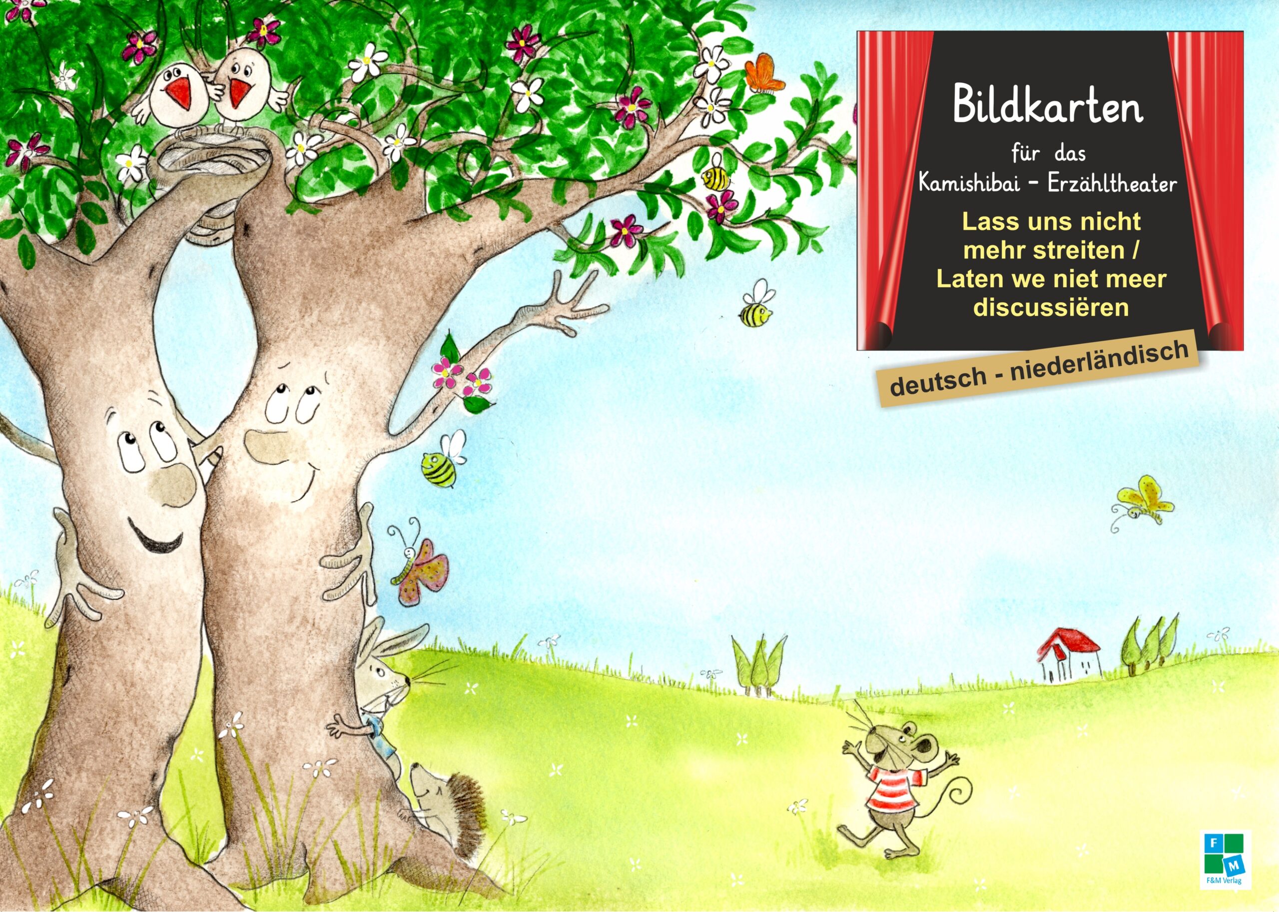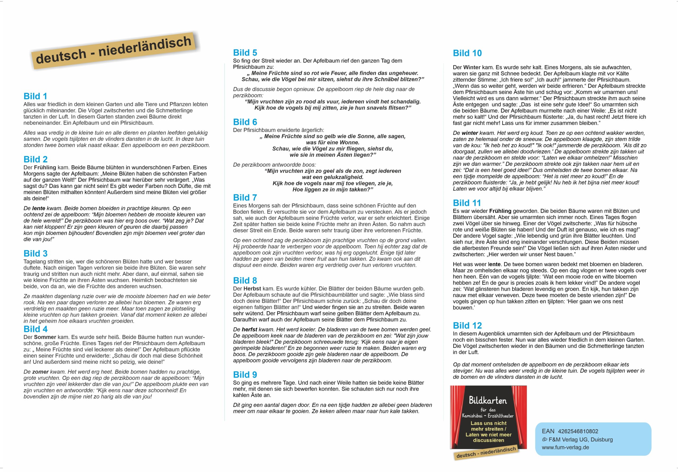 Alle Kamishibais und Kniebücher sind in 27 verschiedenen Sprachen erhältlich: Alles war friedlich in dem kleinen Garten. Und alle Tiere und Pflanzen lebten glücklich miteinander. In diesem Garten standen zwei Bäume. Ein Apfelbaum und ein Pfirsichbaum. Tagelang stritten sie, wer die schöneren Blüten hatte und wer besser duftete…