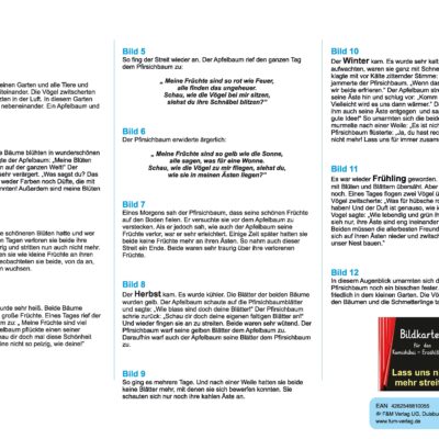 Alle Kamishibais und Kniebücher sind in 27 verschiedenen Sprachen erhältlich: Alles war friedlich in dem kleinen Garten. Und alle Tiere und Pflanzen lebten glücklich miteinander. In diesem Garten standen zwei Bäume. Ein Apfelbaum und ein Pfirsichbaum. Tagelang stritten sie, wer die schöneren Blüten hatte und wer besser duftete…
